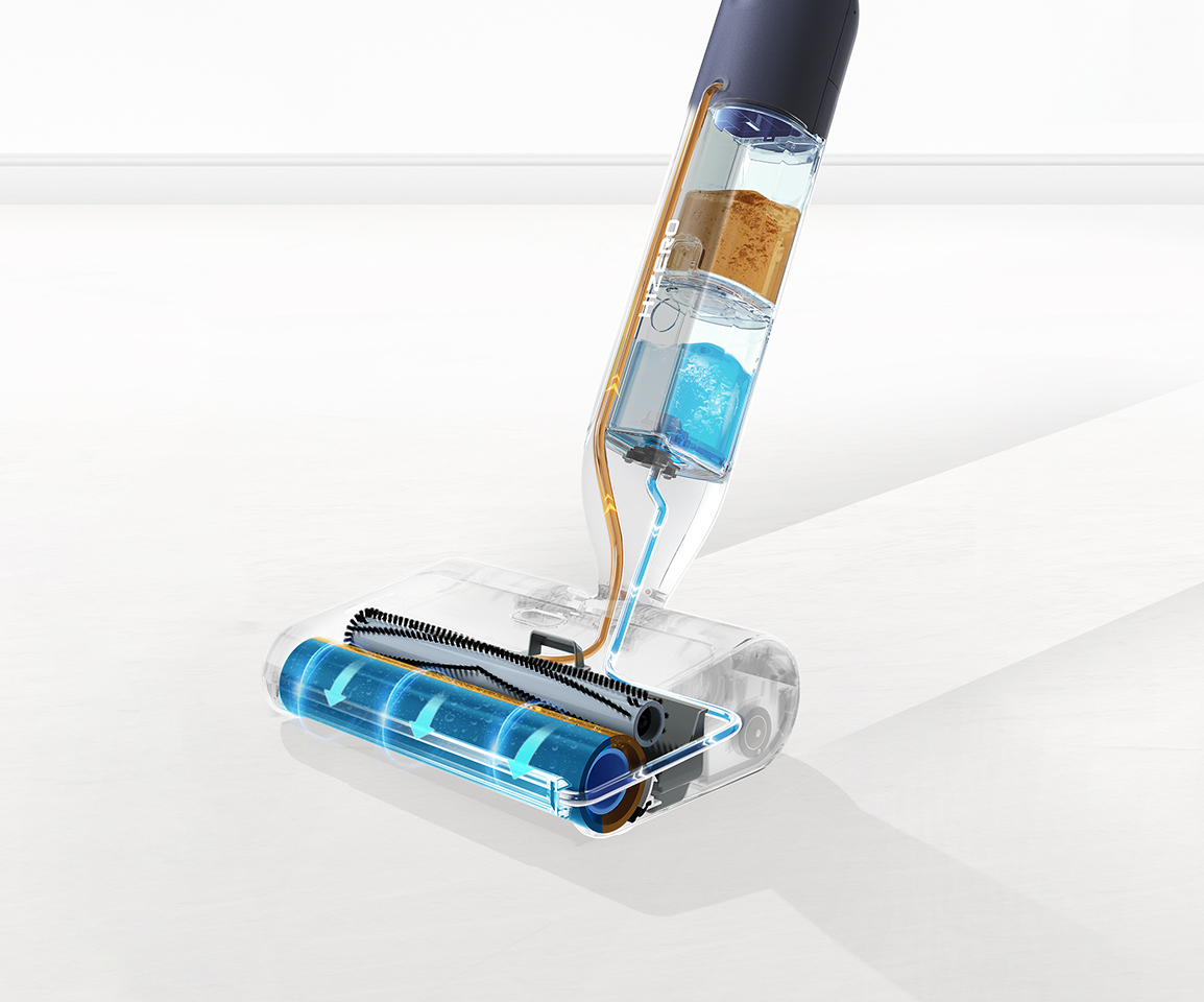 An all-in-one cordless hard floor cleaner that sweeps and mops by using a unique high-density, gentle yet hard-wearing polymer soft surface roller, which also self cleans.